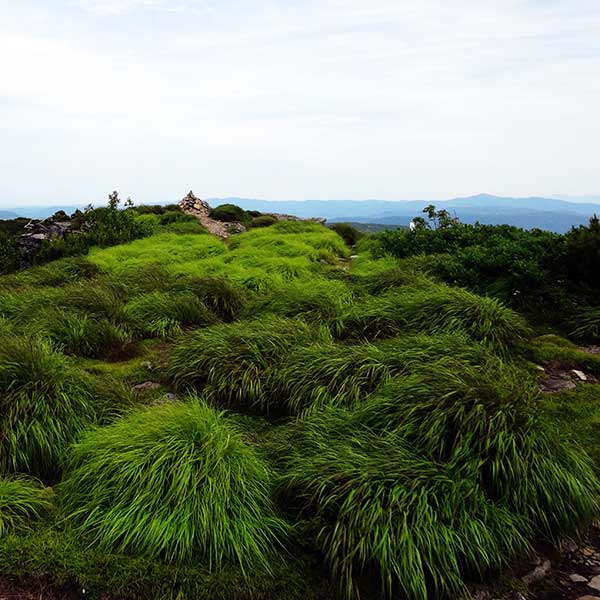 山頂標識の向こう側には、どこまでも続く大雪山系の山々や、天気が良ければ利尻富士まで見渡せる360度のパノラマが広がります。特に目を引くのは、南東へと続く尾根の先にどっしりと構える「尾根棟山」の姿。緑の絨毯を敷き詰めたような稜線が、幾重にも重なり合っています。