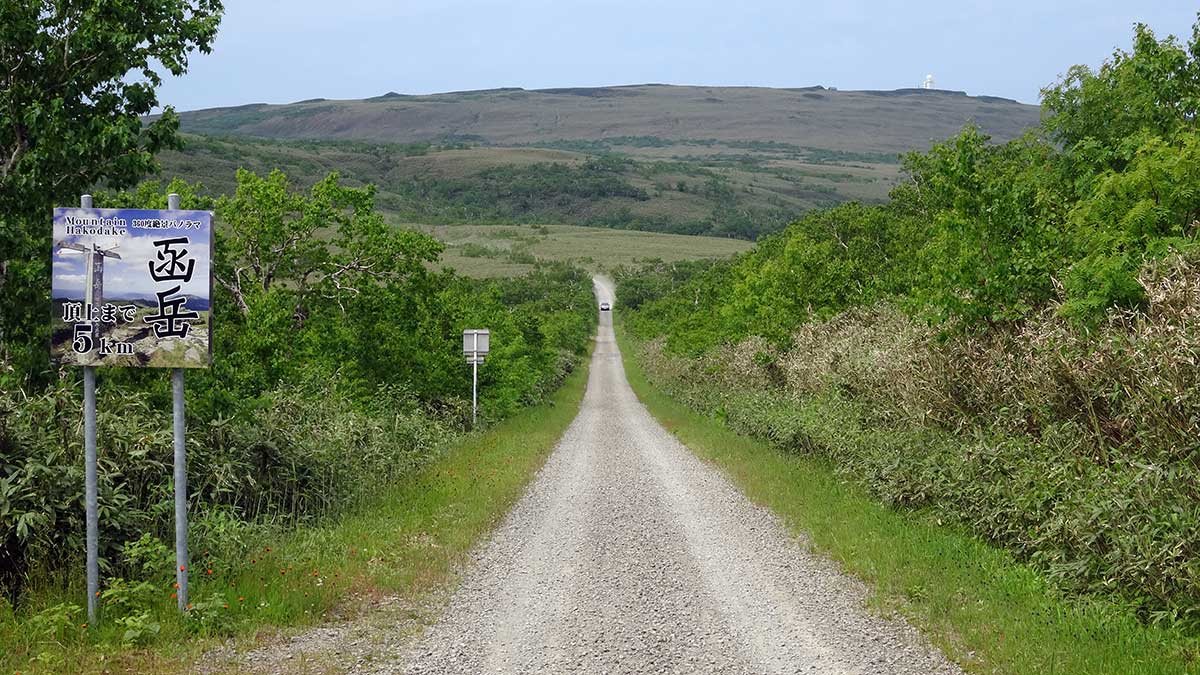 山頂まで残り5km地点。目の前に現れたのは、北海道とは思えないほど真っ直ぐに伸びた「砂利道の直線道路」です。その先には、目指す函岳の頂が堂々と鎮座しています。この光景を目にした瞬間、遠路はるばるやってきた疲れは一気に吹き飛びました。