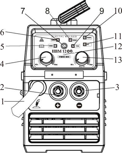 非溶接状態でボタンを数回押して、現在の調整可能なパラメータを選択すると、対応するインジケータがオンになります(インジケータ12)。電圧調整つまみパラメータ値(つまみ16)を調整すると、パラメータの設定値が電圧計に表示されます。溶接状態の電圧計は、溶接機の実際の出力電圧を示します。