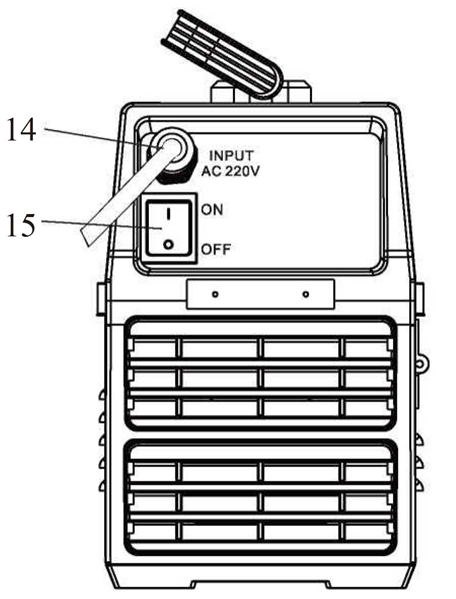 非溶接状態でボタンを複数回押すと、現在の調整可能なパラメータが選択され、対応するインジケータライトが点灯し(インジケータ11)、電流調整ノブでパラメータ値を調整できます(ノブ15)、パラメータのプリセット値が表示されます。電流計に電流計が表示され、溶接状態と溶接機の実際の出力電流が表示されます。