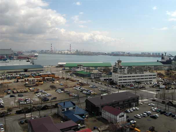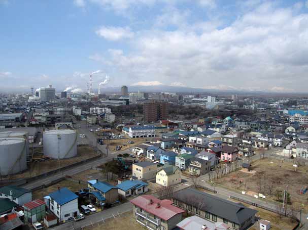 陽だまりの樹からの風景 2005.04.14 ふらさと探訪 陽だまりの樹からの風景 西方向で、左に王子製紙のチップヤード、奥に末広住宅街 遠くに樽前山が雪化粧しています。 奥に見えるのが港の南側にあるコンビナートです。