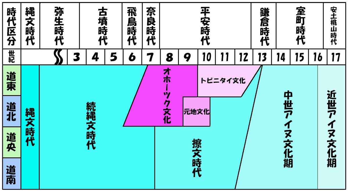 ・オホーツク文化(5世紀〜9世紀頃):北方のサハリン方面から、漁撈(ぎょろう)と海獣狩猟に特化した人々(ニヴフやウリチに近い系統)が北海道の北・東オホーツク沿岸に移住してきた。