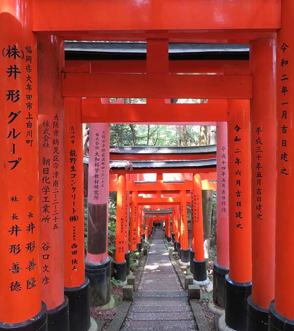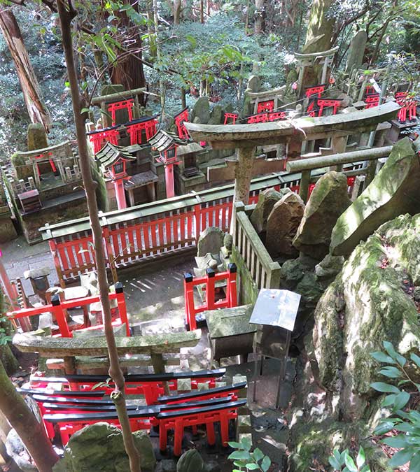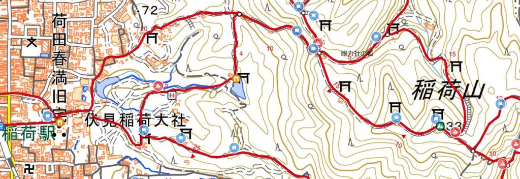 稲荷山は稲荷大神の降臨地で、その峰々を巡拝するのがお山めぐりで、千本鳥居をぬけて奥社奉拝所おくしゃほうはいしょから稲荷山入り口があり、散策路には多くのほこらやお塚がある。参道には数えきれないほどの朱塗りの鳥居続き建ち並ぶ。一周約4キロ、約2時間の散策路が続きます。