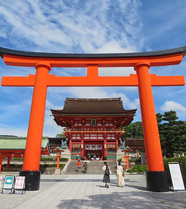 稲荷山は、東山三十六峰の、最南端に位置する霊峰れいほう(海抜233m)で、古くから三ケ峰と呼ばれてきたように三つの峰が西から東へと段々に高く連なり、これを山麓から仰ぐと、まさしく降臨の地にふさわしい山容をそなえています。本社に近い順に三ノ峰・二ノ峰・間の峰・一ノ峰と続き、三ノ峰の北方に荒神ヶ峰がつらなっています。参道には数千もの朱の鳥居が建ち並んでいます。稲荷山に登り、これらの神蹟やお塚を巡拝することを「お山する」といいます。