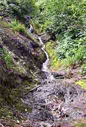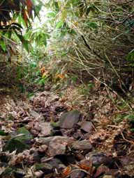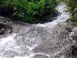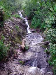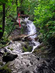 先ほどの出会いからは、水量が半分になりましたが、笹が道を覆うところまで流れていました。