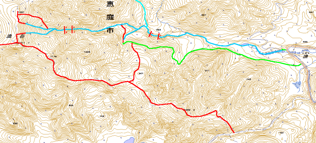 行程時間漁川林道終点駐車場(520m)-50分-C890の滝-30分-出会い-35分-山頂(1318m)-35分-出会い-25分-C890の滝-45分-漁川林道終点駐車場(時間には、休憩時間を含んでいます。)