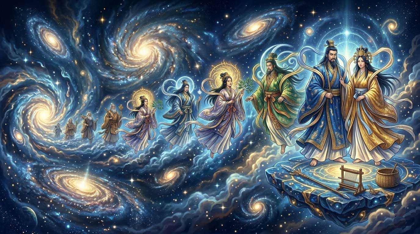 世界の始まり、混沌とした宇宙に最初に現れた5柱の別天神は、性別のない独神として万物の根源となりました。続く神世七代では、抽象的な神から次第に具現化が進み、最後に伊邪那岐・伊邪那美の男女ペアが登場します。この二神が結婚し、修復を繰り返しながら日本の国土を形成していく「国生み」へと繋がります。形なきエネルギーが、具体的な神々の姿へと変化していく、日本神話の壮大なプロローグです。