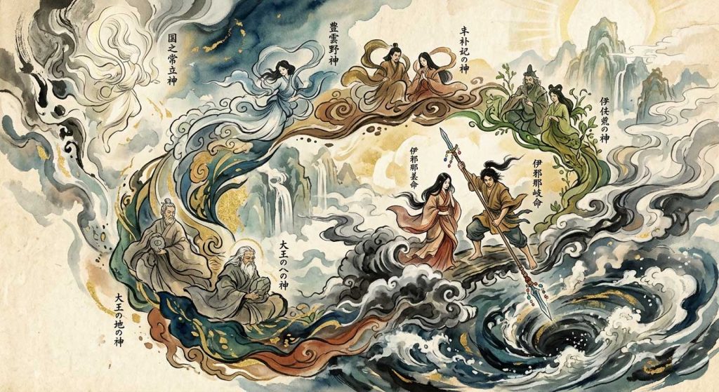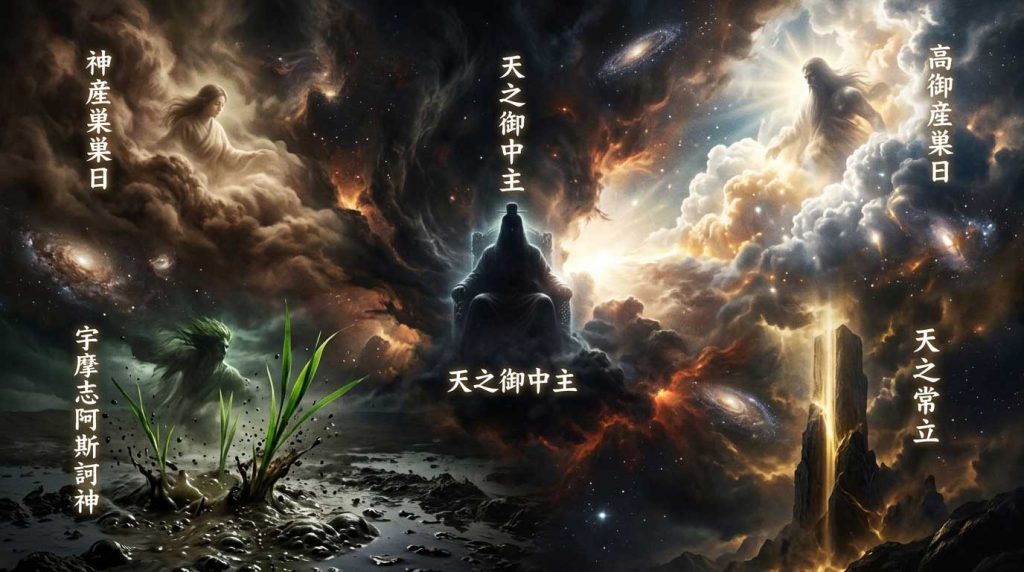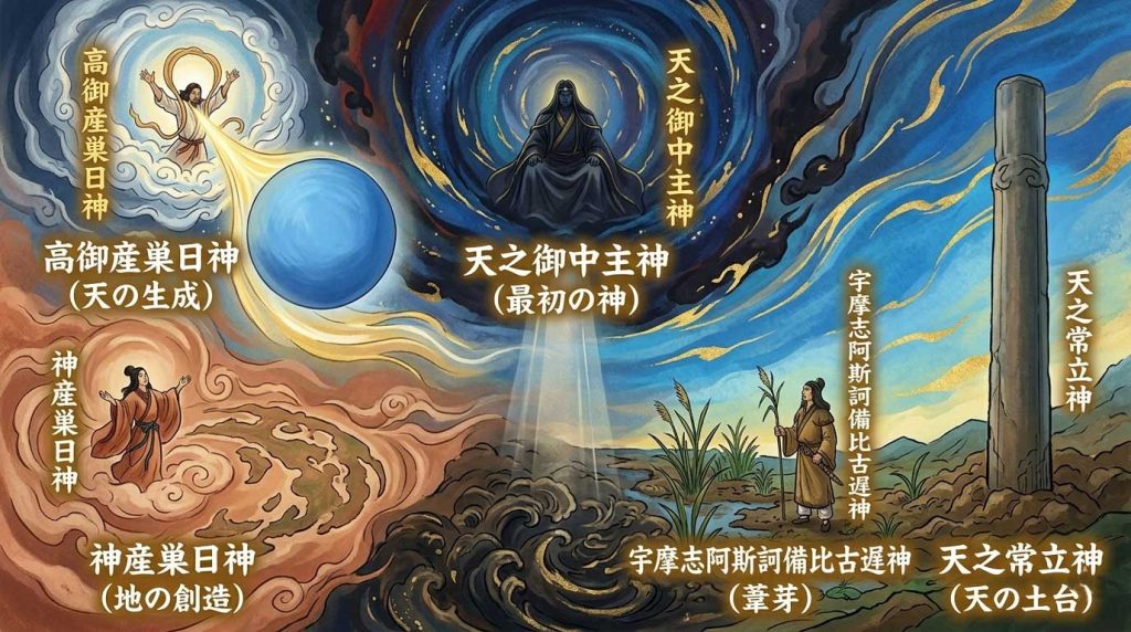 天地が初めて開けた「天地開闢(てんちかいびゃく)」の際、混沌とした世界に最初に現れた神々です。
