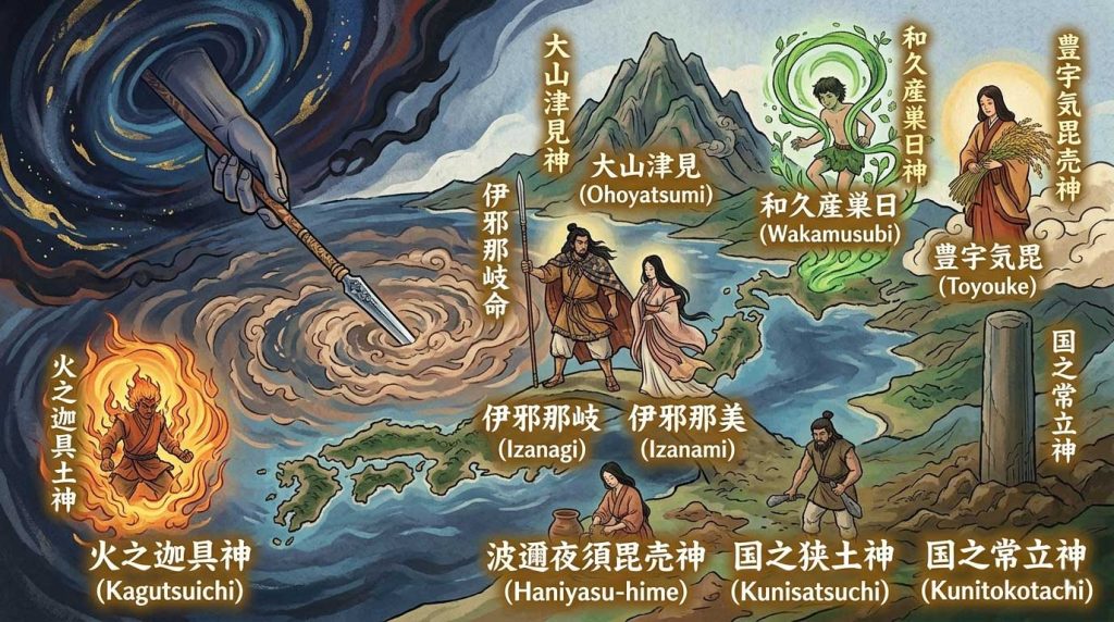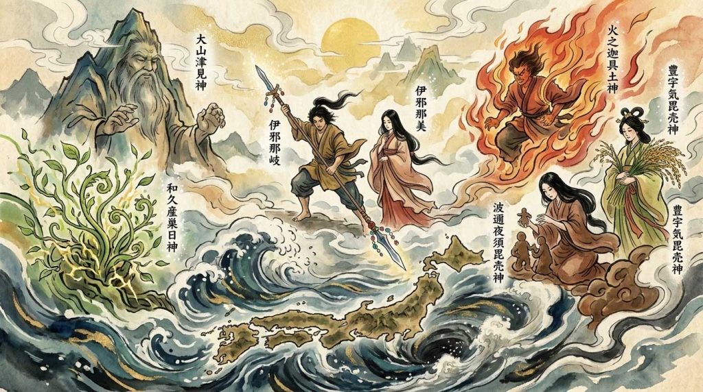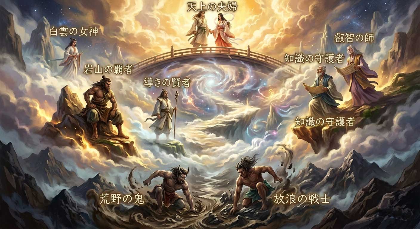 歴史的視点:縄文から弥生へと移り変わる、自然崇拝が擬人化されていく過程を反映しています。最後のイザナギ・イザナミは、小規模な集落(クニ)同士が婚姻や同盟を結び始めた社会構造の投影とも言えます。