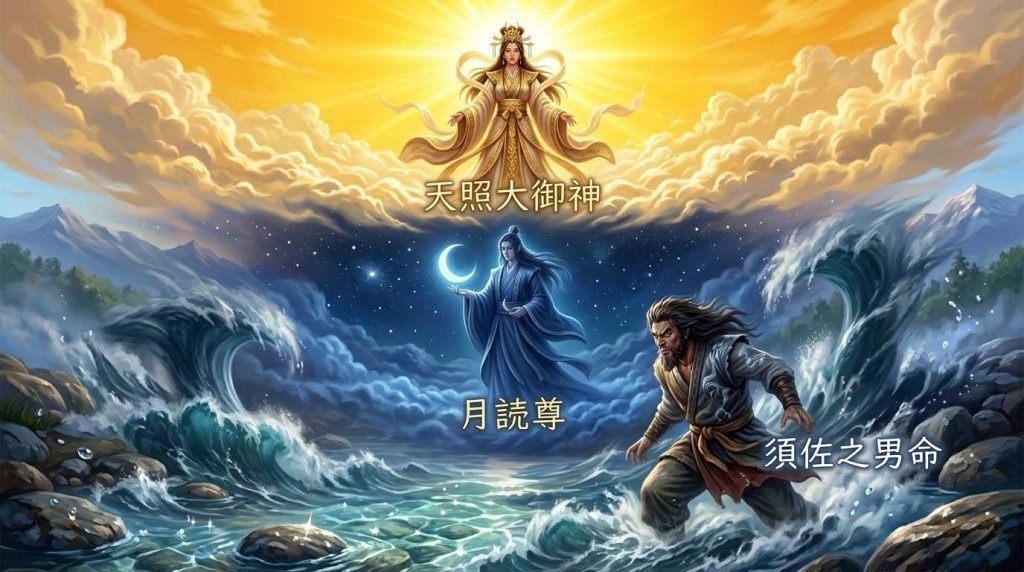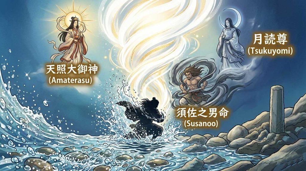 歴史的視点:「水による清め」という弥生時代以降の祭祀文化の定着を示します。アマテラス(太陽=農耕)とスサノオ(海・嵐=交易・軍事)という、支配層に不可欠な二つの属性の分離を表しています。