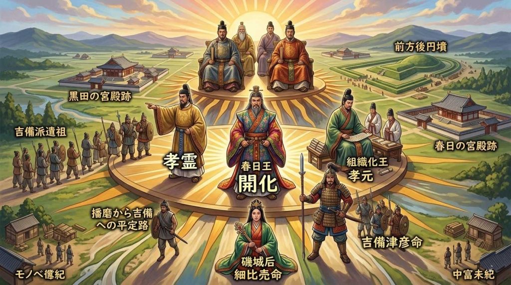 歴史的視点:考古学的には「大和盆地内での小規模な勢力争い」の時期。各地の豪族と婚姻を結び、王権の血筋を大和全体に浸透させていった「地盤固め」の時代と推測されます。