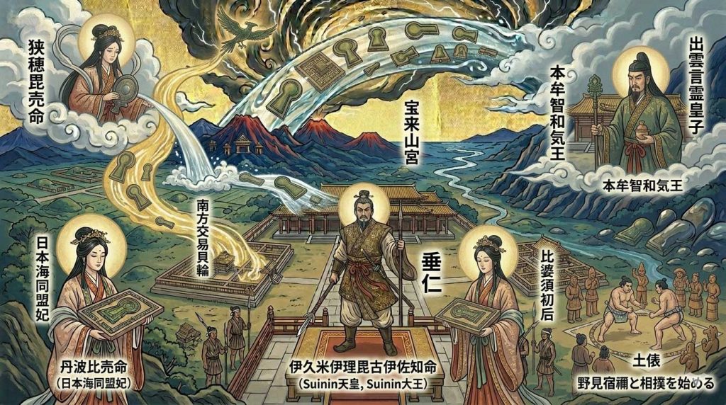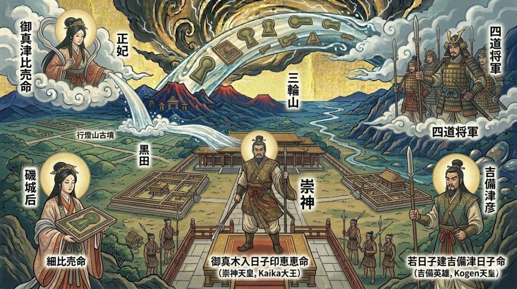 歴史的視点: 巨大な前方後円墳(箸墓古墳など)の築造開始時期。宗教改革を断行し、三輪山の蛇神を祀ることで疫病を鎮めたという伝承は、在来の宗教勢力を王権の管理下に置いたことを示します。