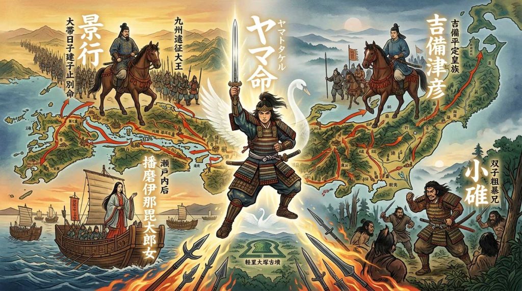 歴史的視点: 鉄剣の普及により軍事力が飛躍的に向上。景行天皇の時代は、九州や東国の豪族を武力で平定した「大和王権の版図拡大」のピークを、タケルという英雄に集約して描いています。