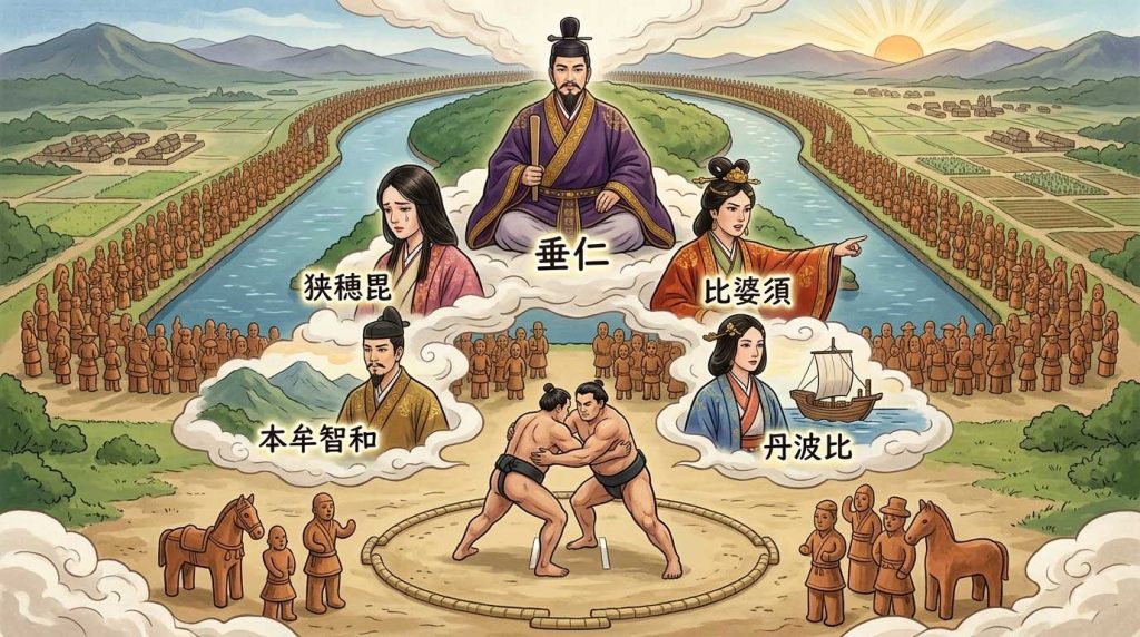 +実在性が極めて高い大王です。伊勢神宮の創建や、野見宿禰(のみのすくね)による相撲の創始、殉死の禁止と埴輪(はにわ)の導入など、現代に続く日本の文化や祭祀の基礎を整えました。