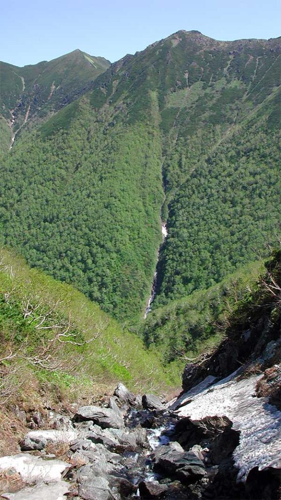 北戸蔦別岳からの北カールなのだが、中央下から一筋の白く見えるのが今回登った川筋で、カールに近づくにつれて勾配が急になっているのがわかる。