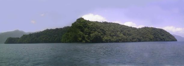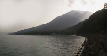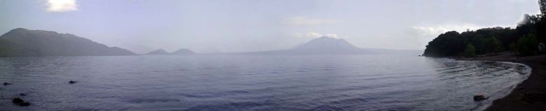 オコタン岬を中心に約160度(4枚の合成)写っています。中央の山が恵庭岳で、1320mの活火山です。これが温泉の源でしょうか。