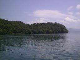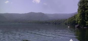 右の写真は、オコタン岬から見たオコタンです。中央部に見える湖畔沿いの白い部分が旧ホテルがある部分です。桟橋の上からの釣り人が良くいます。雨鱒がよく釣れますよ。