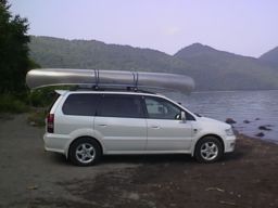 新車と16年前に大阪の錦ロイヤルから通信販売で購入したグラマン社製のジュラルミンのカヌーです。当時カヌーはほとんど見ることはなく、購入も北海道ではできませんでした。今では大分安くなりましたが、当時で25万位でした。金属のカヌーは、沈(ちん)したらどうなるのだろうと思われるかもしれませんが、大丈夫です。艇の前後に浮力材が入っていて沈みません。また、木やFRPのものよりとても軽いです。
