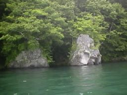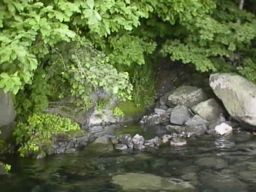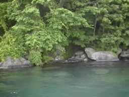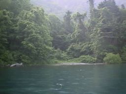 7月の中頃の気候で入るのには良い湯加減でした。水位は湖面と同じ(当たり前ですね)で、腰ぐらいまで有りました。大きな石の上が脱衣場です。ボートを繋留するためのロープが有りました。湯壺の上は、オーバーハングになり木々が茂っています。