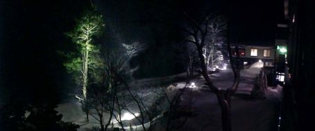 奥に見えるのがホテル本館です。雪の中の庭がライトアップされています。