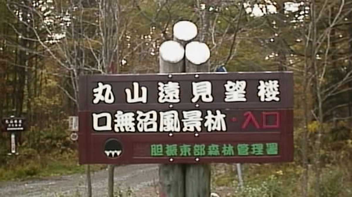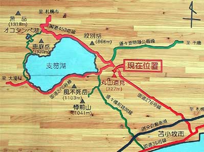 支笏国道からの入口 には丸山遠見と口無沼を案内する看板がありますので、見落とさないようにしましょう。この入口から0.8km入った 十字路にも案内板が有りますので、右折し3.5kmで木製の4本柱に支えられた高さ13mの望楼が目の前に現れます。