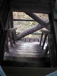 木製の階段を上ると昔は、蓋があり開けて入ったものです。望楼に最上階は広さが一坪ほどで、周囲を窓で囲まれ展望が望めます。窓際には双眼鏡が 置いてありましたが、現在その台のみが有ります。駐車場は望楼の東側に有り、数台分の広さがあります。