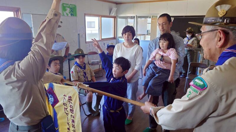 まず、新しいカブスカウトが壇上に立ち、みんなの前でしっかりとした声で誓いを立てました。その姿を見守るスカウトたちとリーダー、そして保護者の皆さんの表情には温かな笑顔があふれます。仲間の誓いが終わると、会場全体から祝いのかけ声「おめでとう!ウォー、ウォー、ウォー!」が一斉に響きました。新入スカウトも少し照れた様子で「ウォー!」と返礼し、和やかな拍手に包まれながら新しい一歩を踏み出しました。こうして晴れて仲間入りを果たした兄弟スカウトを、団のみんなが心から歓迎しました。