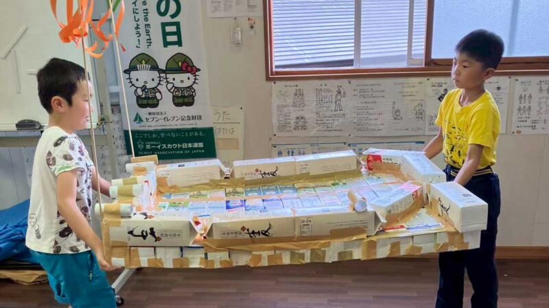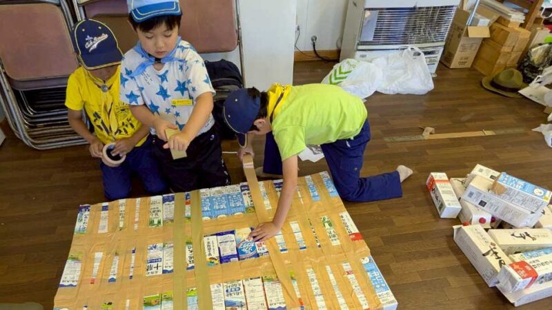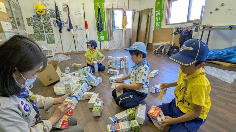上進式のあとは、ビーバースカウトとカブスカウトが楽しみにしていた工作活動です。この日のテーマは「牛乳パックで船を作ろう」。床にはたくさんの牛乳パックとガムテープ、はさみ、マジックペンなどが並べられ、スカウトたちは顔を輝かせながらすぐに製作に取りかかりました。