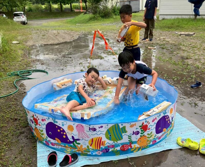 船が完成したところで、スカウトたちは協力してスカウトハウスの2階から船を慎重に運び出しました。外にはあらかじめ準備された大きなビニール製プールが待っています。いよいよ浮かべる実験の時間です。