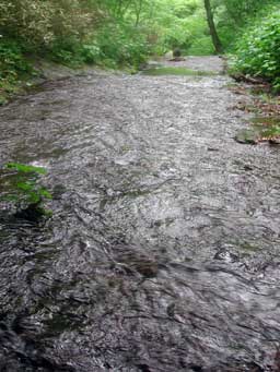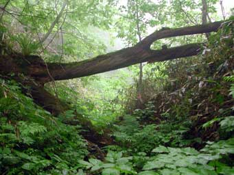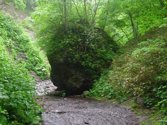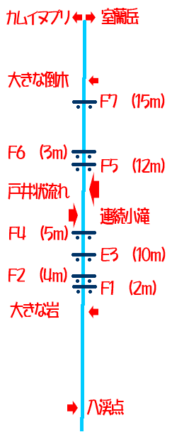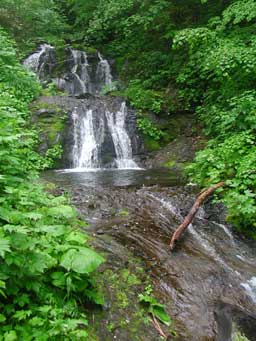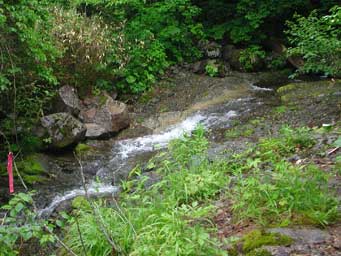 ここ滝沢は、2kmに満たない沢で難しくはありませんが、とても綺麗な流れの連続です。天気が良ければ、木漏れ日の中、苔むした岩の間を姿を変えながら流れる水を心から楽しめます。こんな所にこれだけの沢が有ったのかと驚くことと思います。いくら簡単な沢といっても、苔むした沢ですので、登山靴やスニーカーでは怪我をしますので、靴底にフェルトを張った沢専用の物でなければなりません。行程の中で迷うような所は有りませんが、必ず地図とコンパスを持って行きましょう。また、この沢も裏沢もそうですが携帯が通じませんので、出来るだけ複数での行動が無難です。