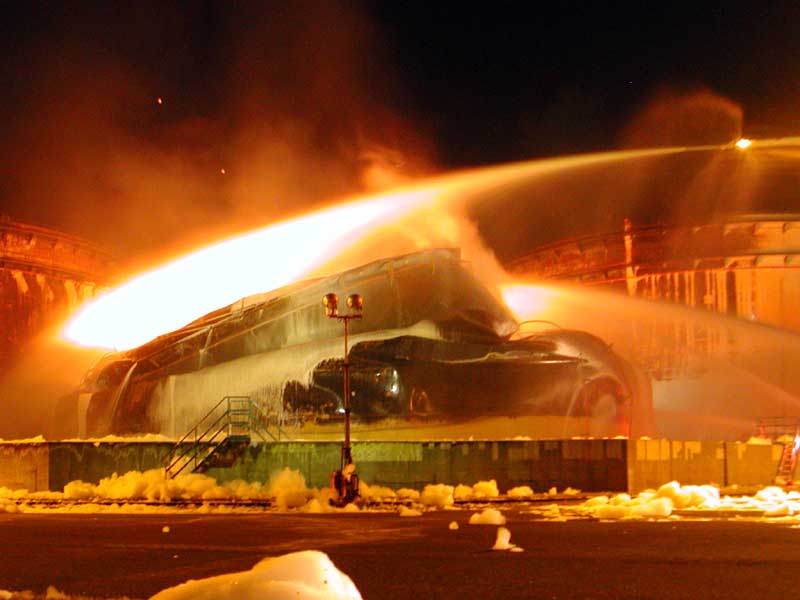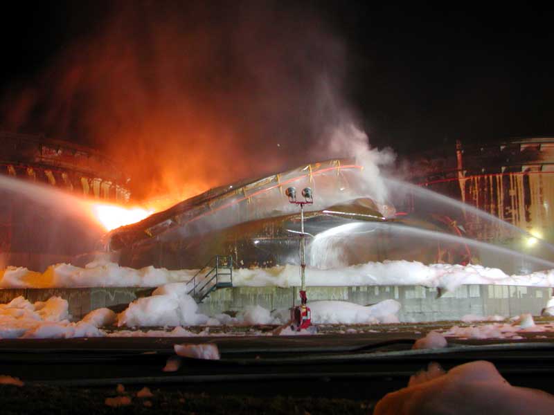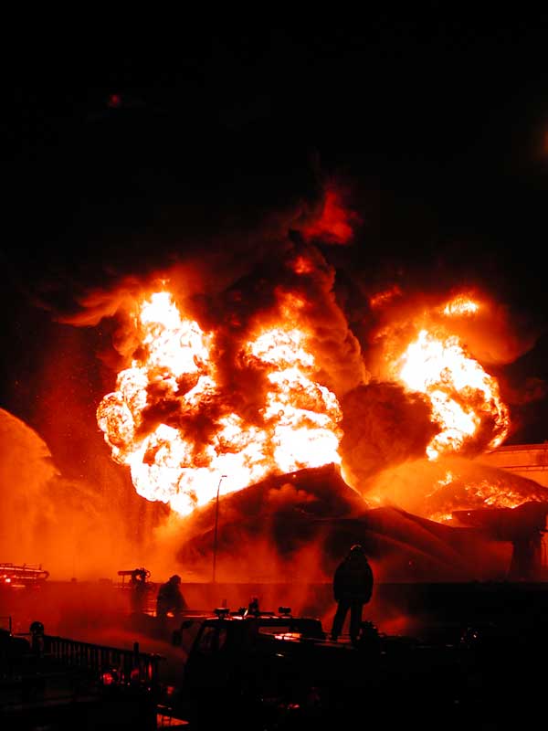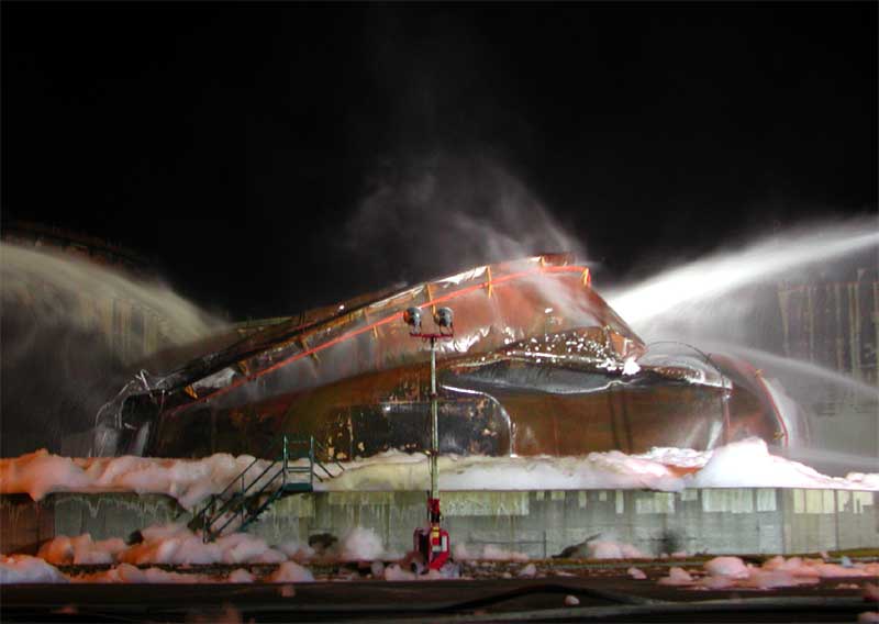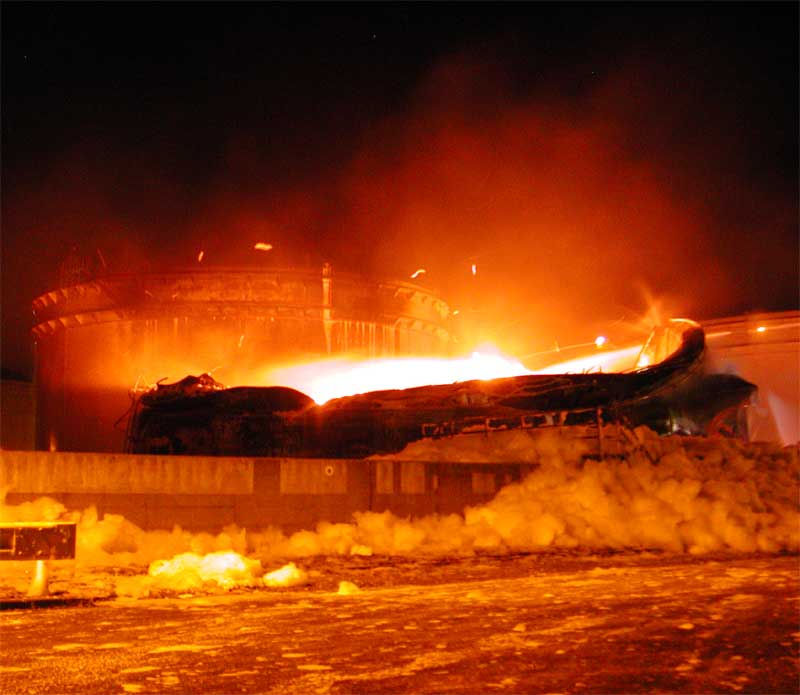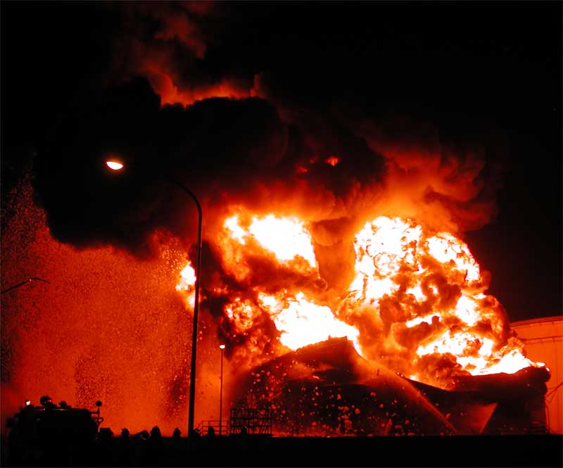 誰もがこのまま消えるものと思いながら消火活動を続けていたそのとき、一瞬にしてタンクが爆発的に炎に包まれた瞬間の写真である。爆発的な炎の上昇とともに周囲の泡消化剤の泡が瞬時に舞い上がっているのがわかる。どれほどの燃焼が一瞬にして起きたか想像がつくだろう。