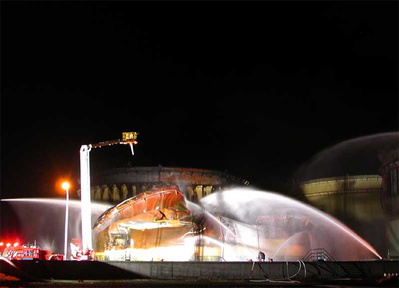 タンクの炎は深夜に灯火程度になり、消火のめどが立ったかに見えたが、座屈したタンクと浮き屋根の陰から顔を出すこの灯火はなかなか消えない。緊張が緩和されると疲れが増してくる深夜の活動。
