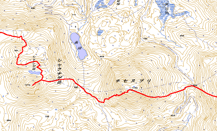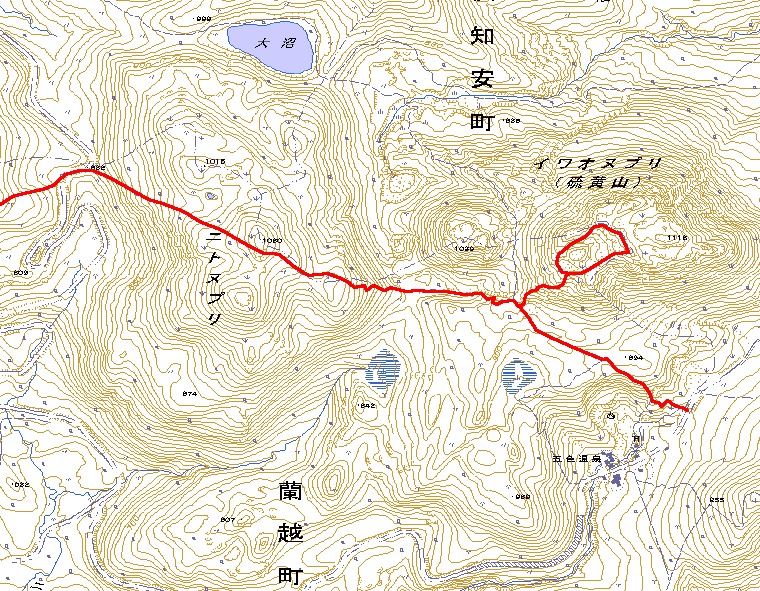 行程時間(休憩は含んでいません。)新見峠(747m)-25分-白樺山(923m)-60分-シャクナゲ沼-15分-シャクナゲ岳(1074m)-70分-チセヌプリ(1134m)-35分-国道-40分-ニトヌプリ(1080m)-45分-分岐-30分-イワオヌプリ(1116m)-20分-分岐-25分-五色温泉(770m) 休憩除く全行程:6時間5分