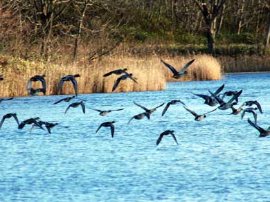 この沼は、沼の北と南から沼畔に行くことがでる。北側は苫小牧西インターチェンジ手前の北海道ゴルフ倶楽部への道を行くと昇龍トンネル手前右手(左下写真)に見え、右前方に記念碑?が有り細い道を入ると駐車スペースがある。南側は、道々樽前錦岡線から樽前カントリークラブに入る道(錦橋)の反対側(東側)に入る道を東に750m程行くと右にカーブするところに小さな赤い鳥居が有る。そこに車を置いて入っていくとすぐに沼の南側に着く。所有者の名から「大沢沼」と呼ばれることもある。夕方に行ったのだが、数百羽の水鳥が飛び交っていた。