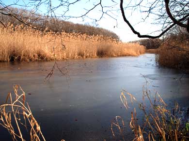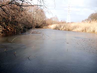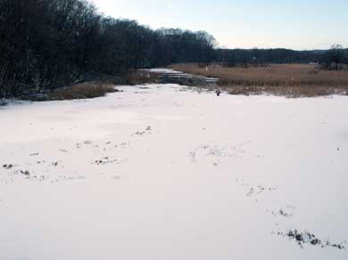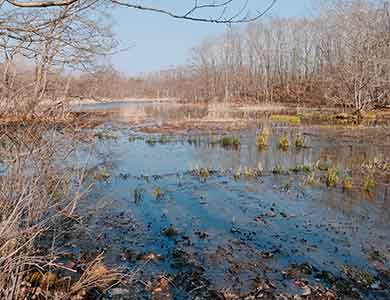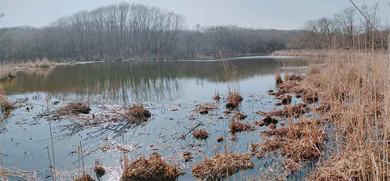 沼は思った以上に大きく、春先なのでグーグル画像より一回り大きく、北側からの入水を確認できる。沼の形状から、自然の沼であることがわかる。