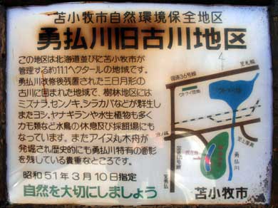勇払川旧古川地区は勇払川の河川改修によって三日月形に残された部分で、勇払川の原風景を残す場所として、1976年に苫小牧市の自然環境保全地域となった。この地区では、先住民であるアイヌ民族が使用していた丸木舟が見つかり、また川の東側には樹齢200年近いミズナラやハリギリなどが自生する林があって、原野では少なくなってきたアオサギのコロニーもあった。