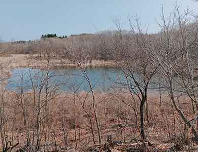 地図で道路を確認できるが、道をたどるのではなく、丘を越えて沼に向かうと春には沼全体が見渡せ、かつ、最短で沼に出る。車幅の道路がおおむねついていて、迷うことはなく、沼の3/4ほどを回ることができる。