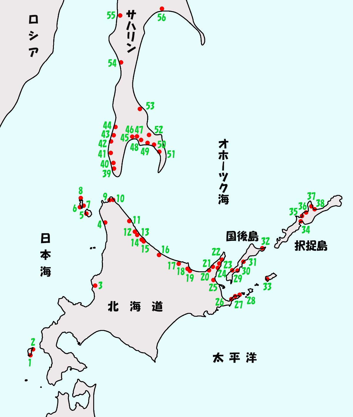 上記図以外にも、礼文利尻島には、神崎遺跡・上泊遺跡・香深井5遺跡・香深井6号遺跡・ペシ岬遺跡・利尻富士町役場遺跡・種屯内貝塚・沼浦海水浴場遺跡。道北には、ホロベツ砂丘遺跡。道東には、オムサロ台地竪穴群・湧別町西遺跡・栄浦第二遺跡・常呂川河口遺跡・能取岬西岸遺跡・カモイベツ遺跡・チャシコツ遺跡・チャシコツ岬上遺跡・ウトロ遺跡・知床岬遺跡・知円別川南岸遺跡・トビニタイ遺跡・オタフク岩遺跡などがある。また、カムチャッカ半島突端の占守島長崎遺跡などがあり、国内は奥尻から稚内、そしてオホーツク沿岸の納沙布岬に分布し、北はサハリン北部、東はカムチャッカ半島突端までオホーツク文化は広がっていた。