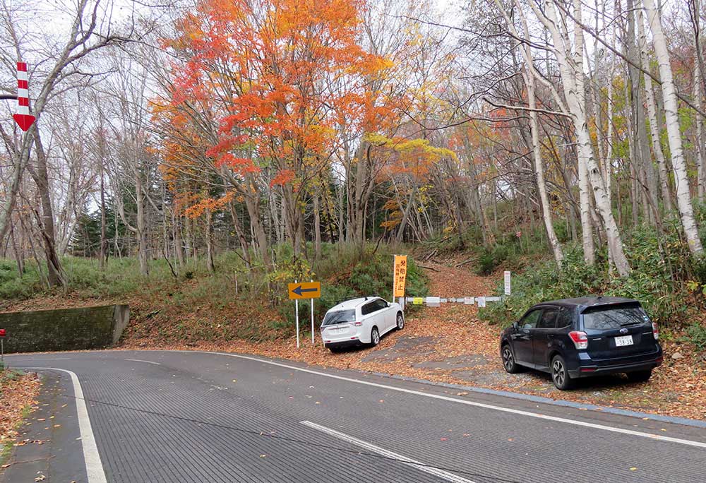 恵庭岳滝沢ルート登山口が大きく崩れていて、ここから先の林道を車で行くことはできない状況である。