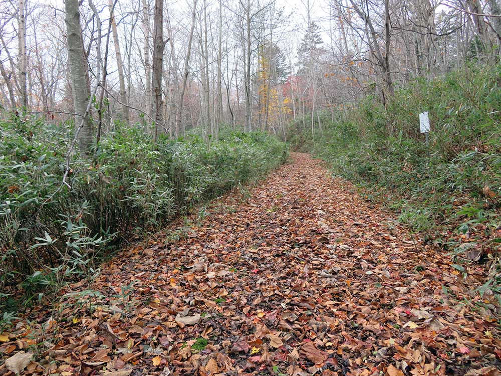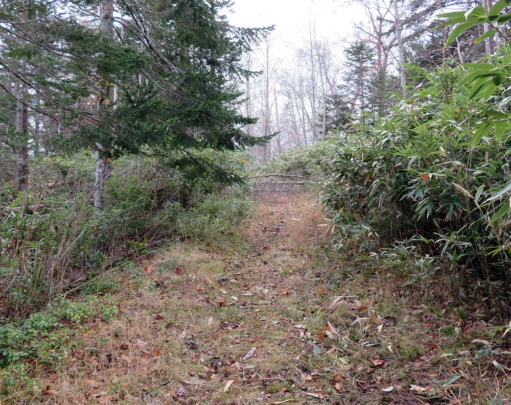 途中には2メートル近い丈のチシマザサの群生地を抜けると、太い幹の樹木が点在する地域にたどり着く。