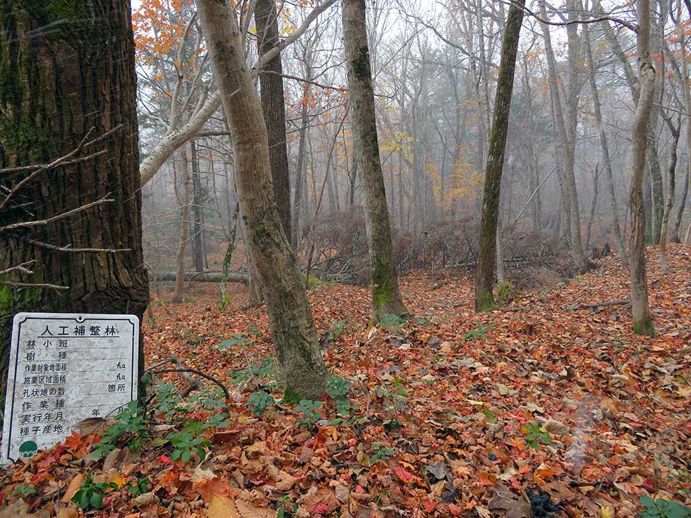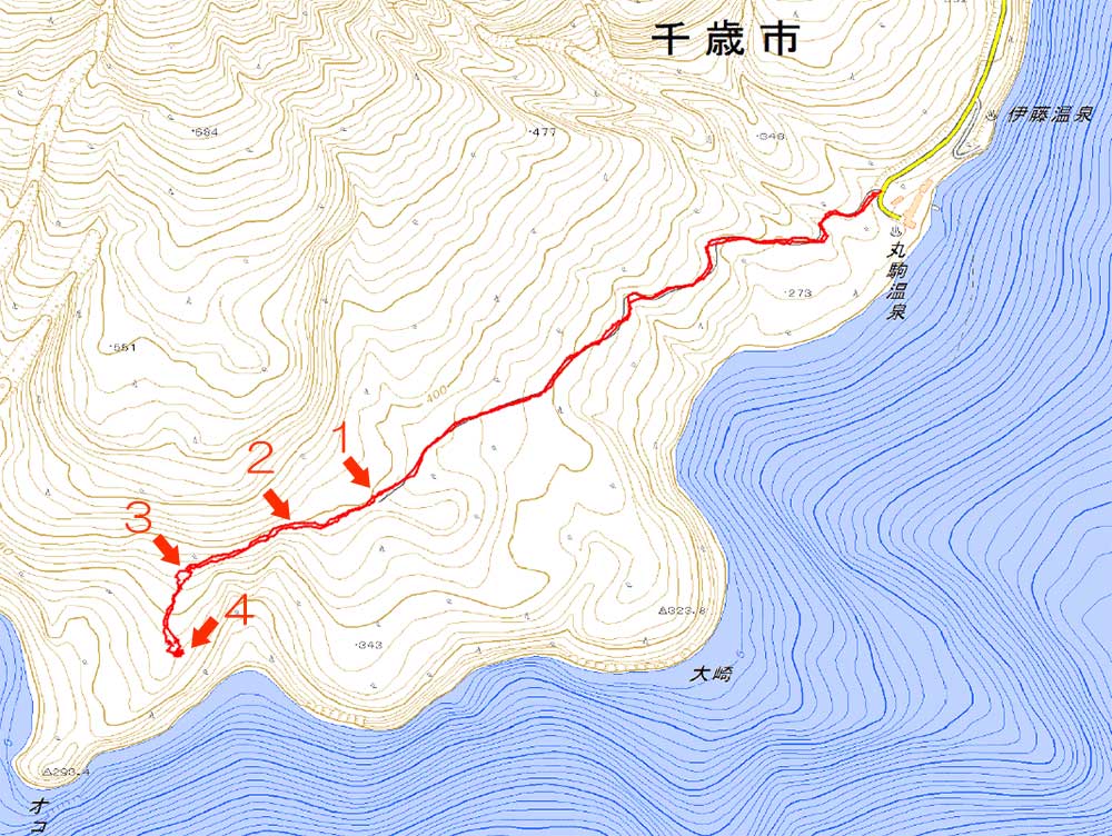 入口は丸駒温泉手前の林道ゲートで、林道を進むこと30分ほどで林道が終わり(No1)、そこから道が狭まり、竹藪(No2)となり熊鈴が必要な時間が約5分ほどで作業道跡を進み、視野が広がる(No3)。水平の作業道を離れ、下っていく作業道を進むと巨木が見える(No4)。