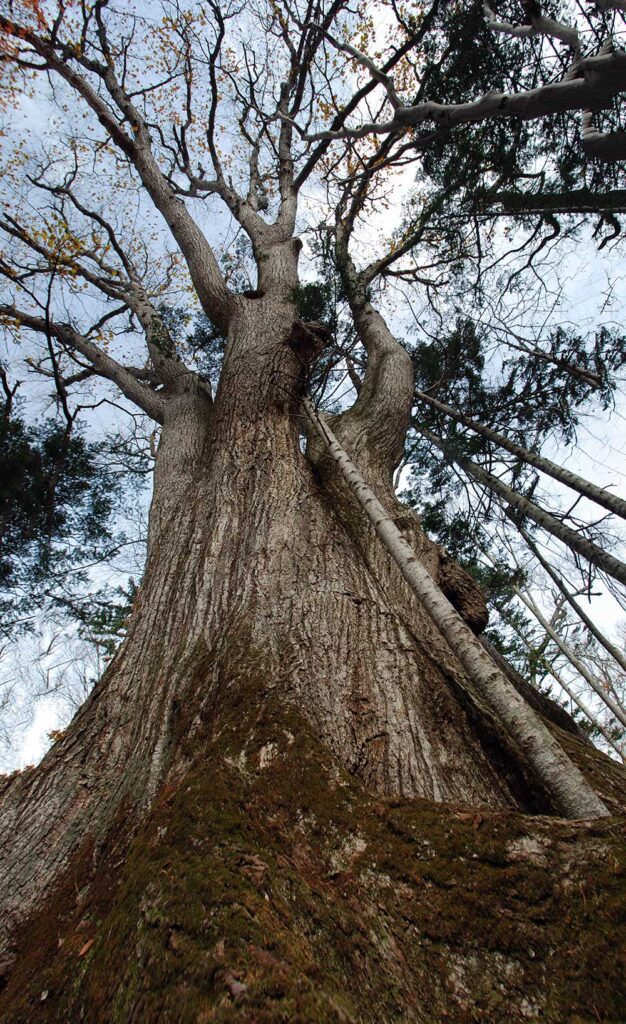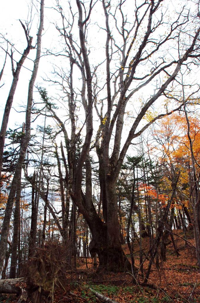 推定樹齢1200年のミズナラは、幹周4メートル前後の木々と比べても風格が際立つ高さは約30メートル。