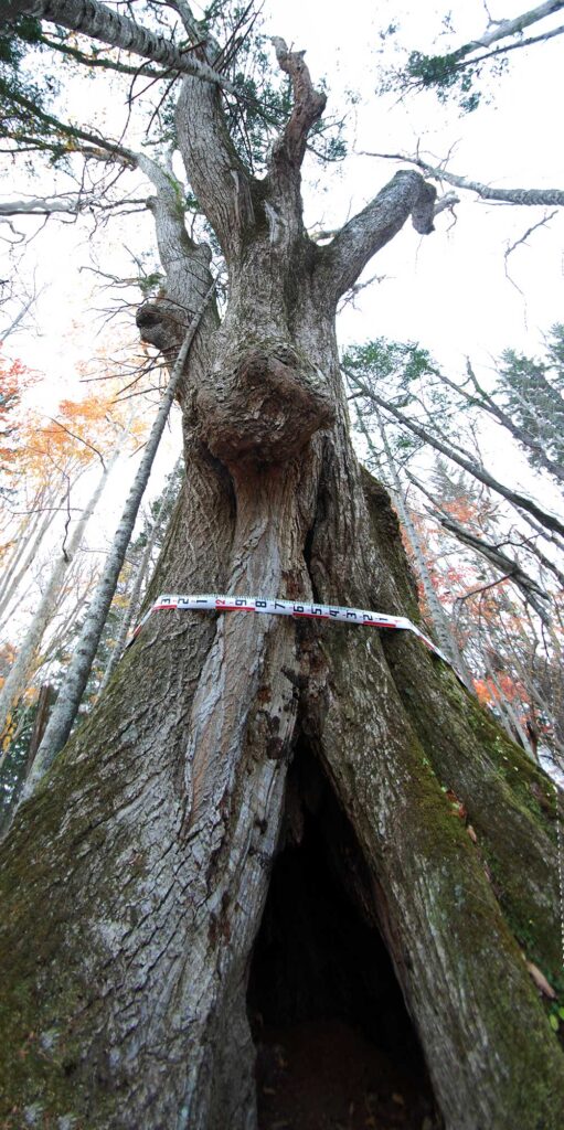 風による倒木や人が行う伐採を免れ、森が形成される大自然の移り変わりを見詰め続けた巨木。