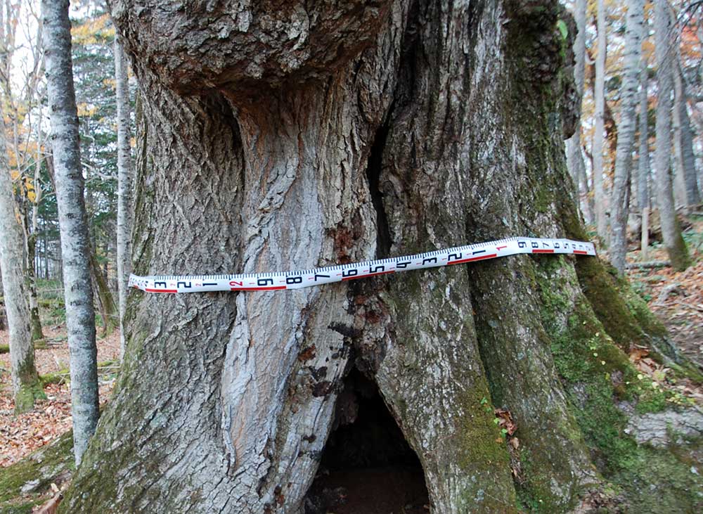 先田さんによると幹周4メートル前後のミズナラやエゾマツ、シナノキなどで、樹齢にして400年前後という。