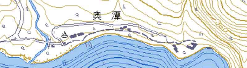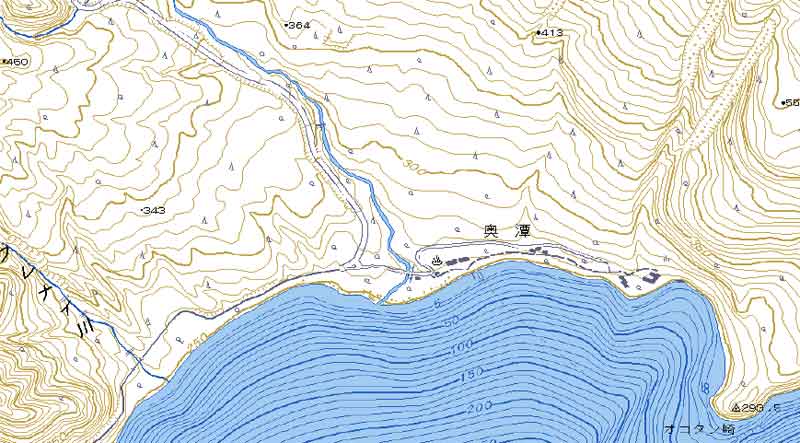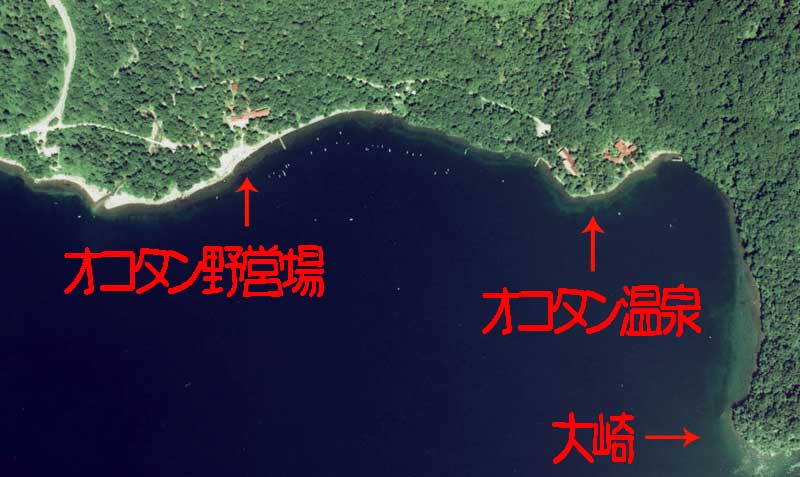 国土地理院の地図を見ると奥潭(支笏湖北部)の地名に温泉マークが有り、昔ここをオコタン温泉と呼び、オコタン荘と支笏湖グランドホテルがありました。現在残っているのは、オコタン野営場の管理棟としてオコタン荘が残っているだけで、支笏湖グランドホテルは有りません。