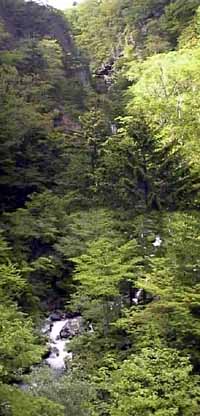 この滝口は、左の写真でいうと上から7分に1の所でVの字になっている所です。青葉が盛んなこの時期のため滝全体は見えませんが、地図では滝口から橋の下の川までは約110m有ります。結構な高さですよ。