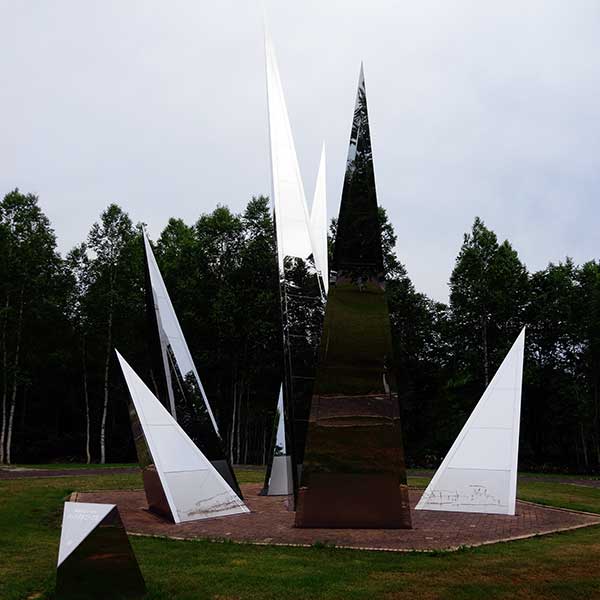 パーク内にある透明感あふれるモニュメントが、夕闇の中でどこか幻想的に光っていました。明日はついに、念願のピッシリ山。北海道百名山の最後の一座として残ることも多いこの山は、道北の奥深く、人を寄せ付けない威厳を放っています。「通行止めさえなければ普通の山なのだが……」そんな思いを抱きながら、明日の長距離移動に備えて早めに目を閉じました。