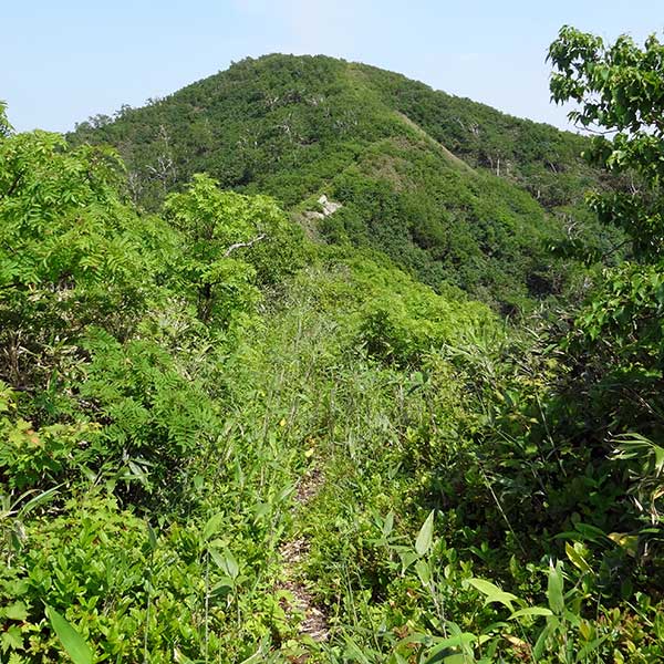 笹を漕ぎ、倒木を跨ぎ、不明瞭な踏み跡を追う作業が続きます。道北の山の深さ、険しさを足の裏からひしひしと感じる登りです。