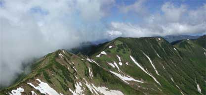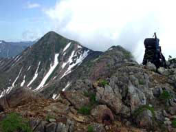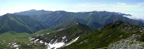 急斜面を登り、さらに登り切ると北戸蔦別岳ですが山頂プレートはなく、遠望から見た鋭さとは相まって山頂そのものは穏やかなものでした。山頂からの眺めは、幌尻岳よりも一 段と鮮やかに目に飛び込んできます。なんと言っても七ッ沼カール越しに見る南日高の山々は格別なものがあります。