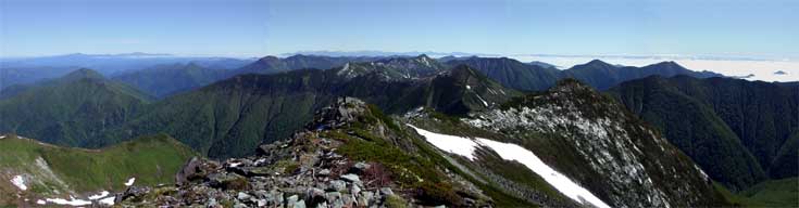 山頂にも思わぬ雪を見る。しかし、登頂の時は暖かい山頂で、北も南も日高が全開でした。